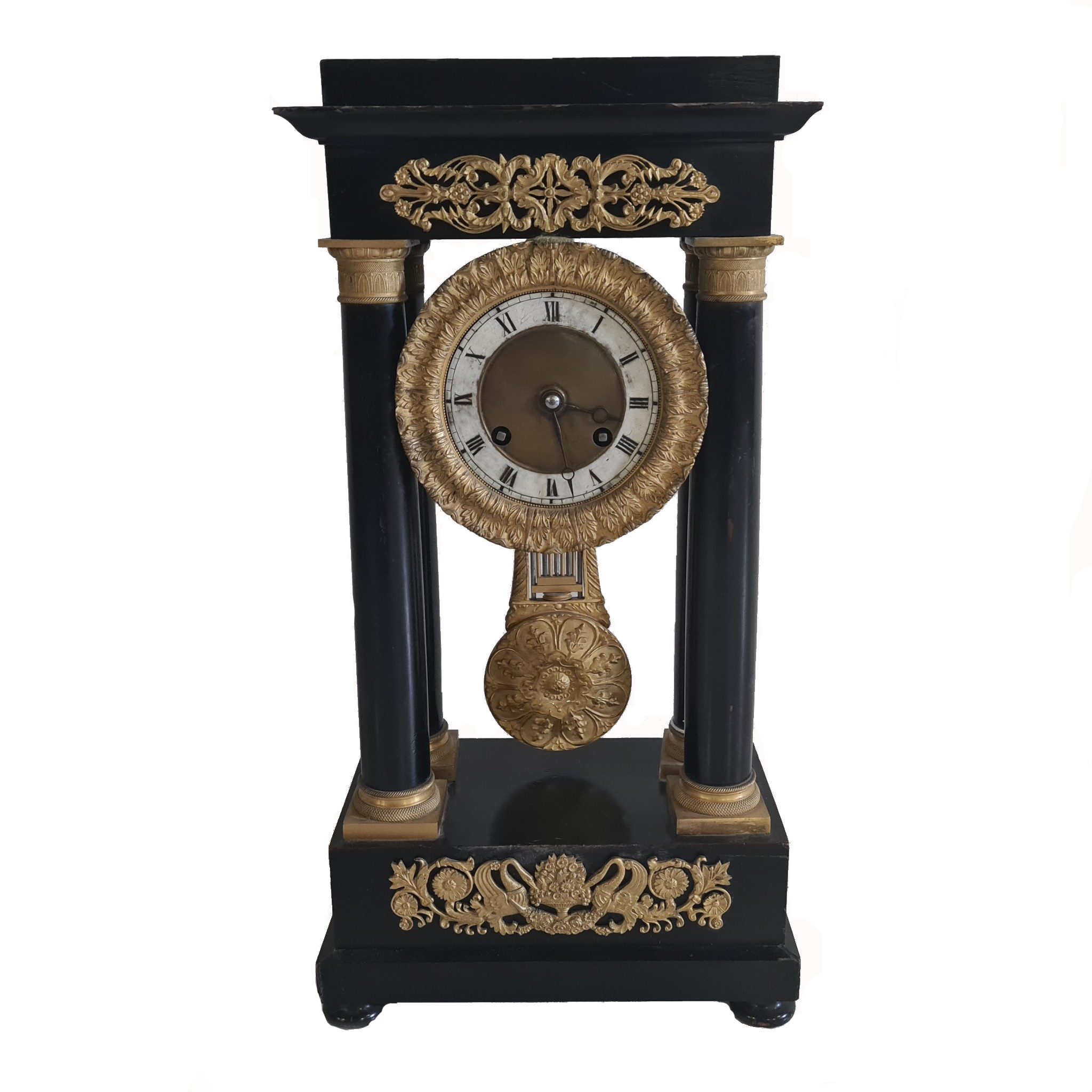 Materiál: dřevo černě lakované, bronz. zlacený detail, kvádrový sokl se čtyřmi sloupky a vrchní římsou, siferník stříbřený, číslice římské , stroj s půlovým zvonkovým bitím.