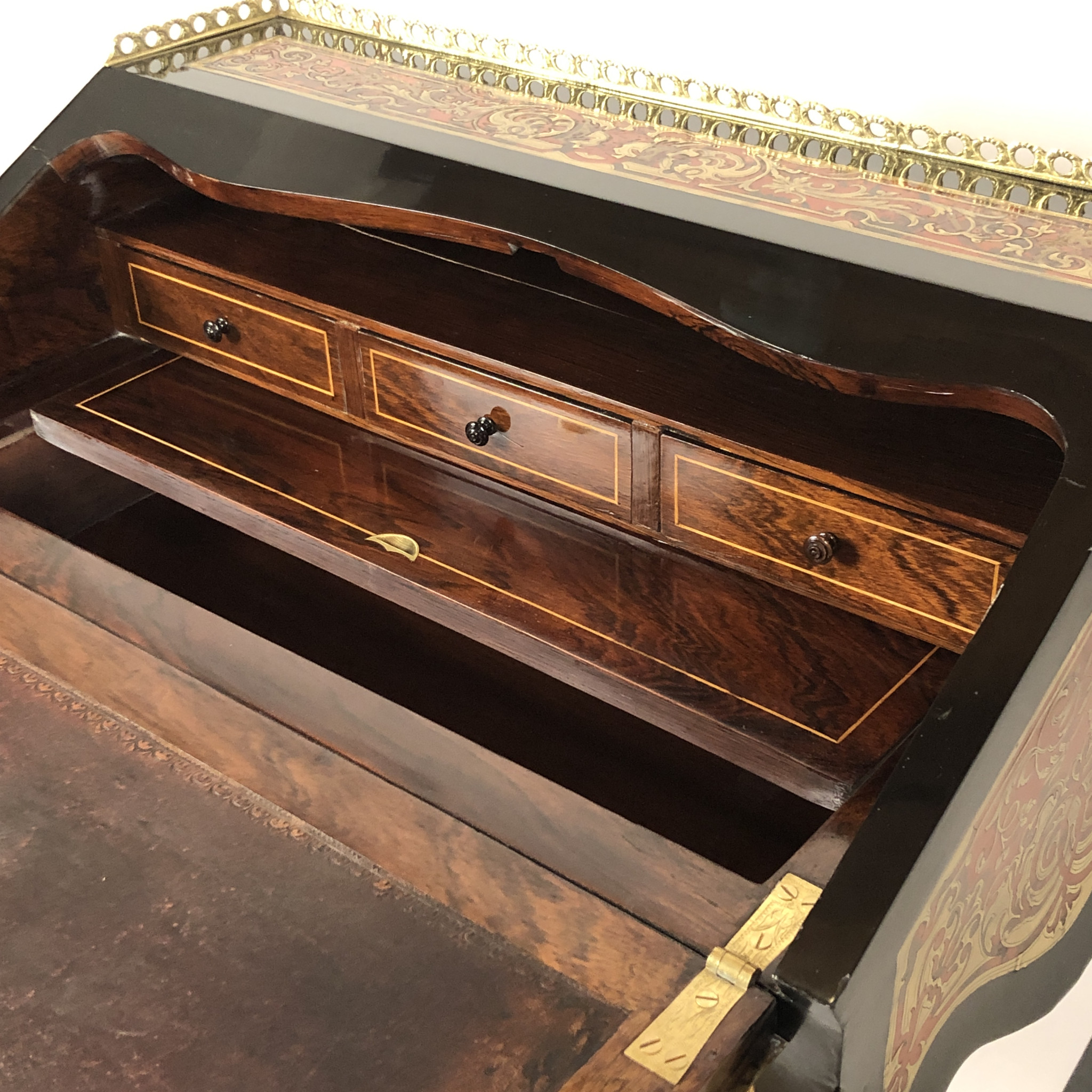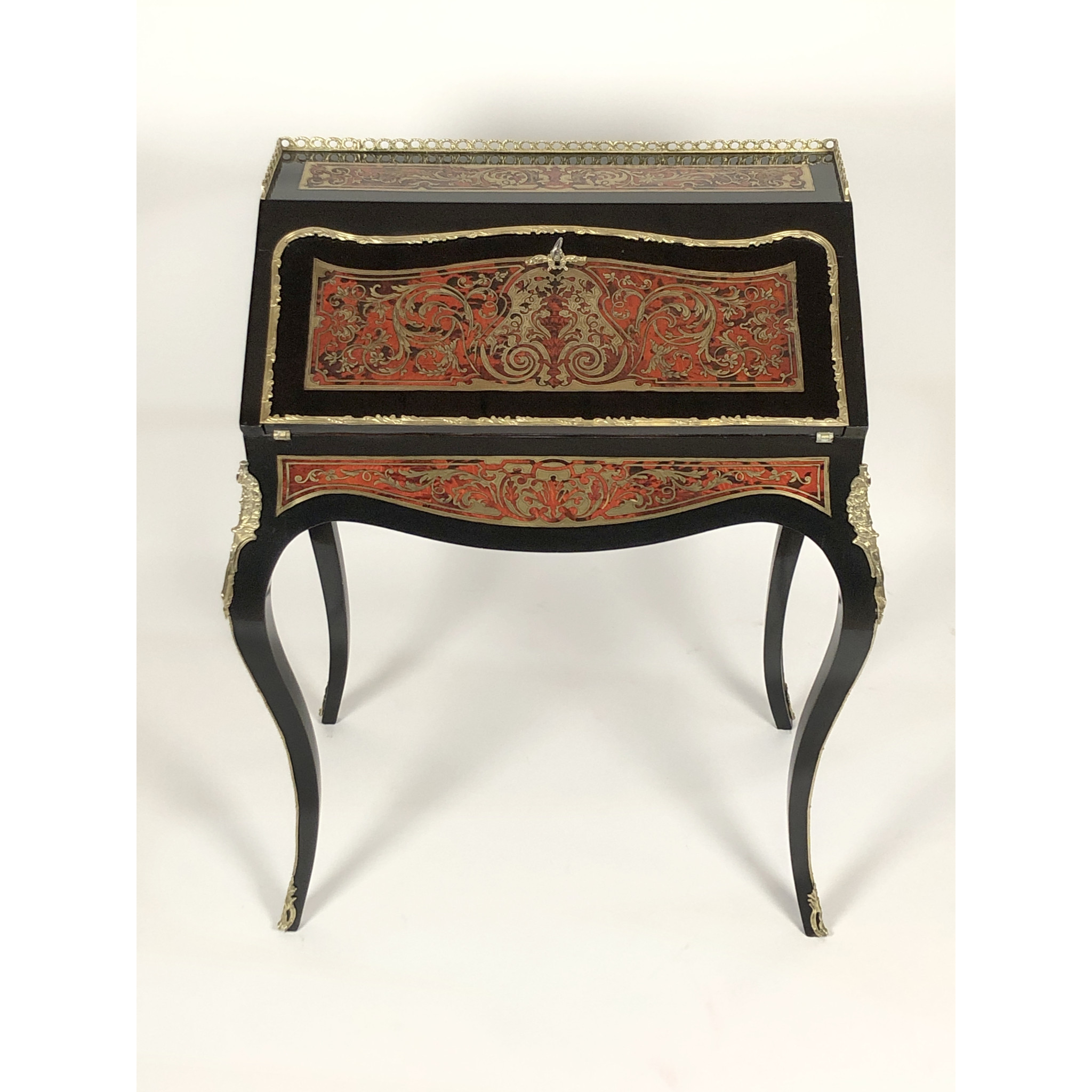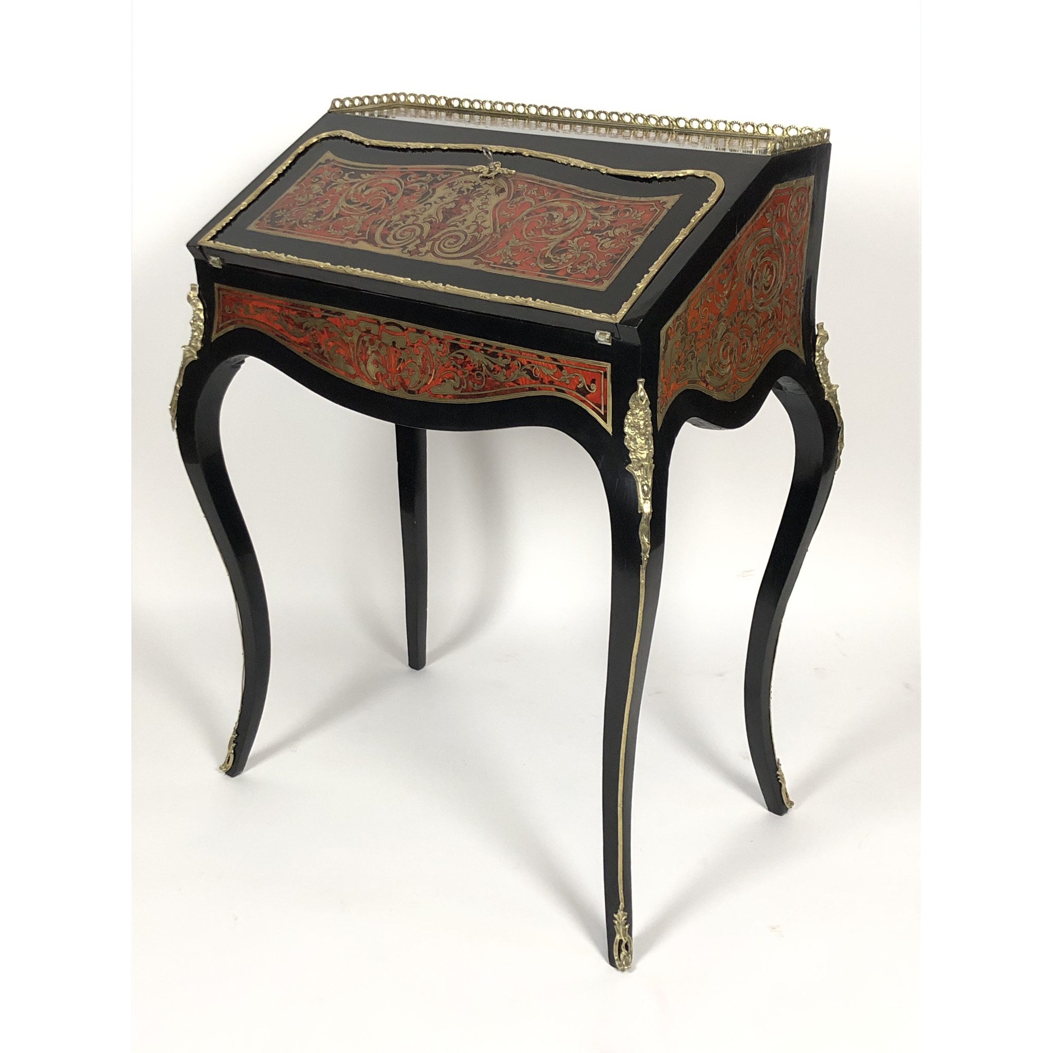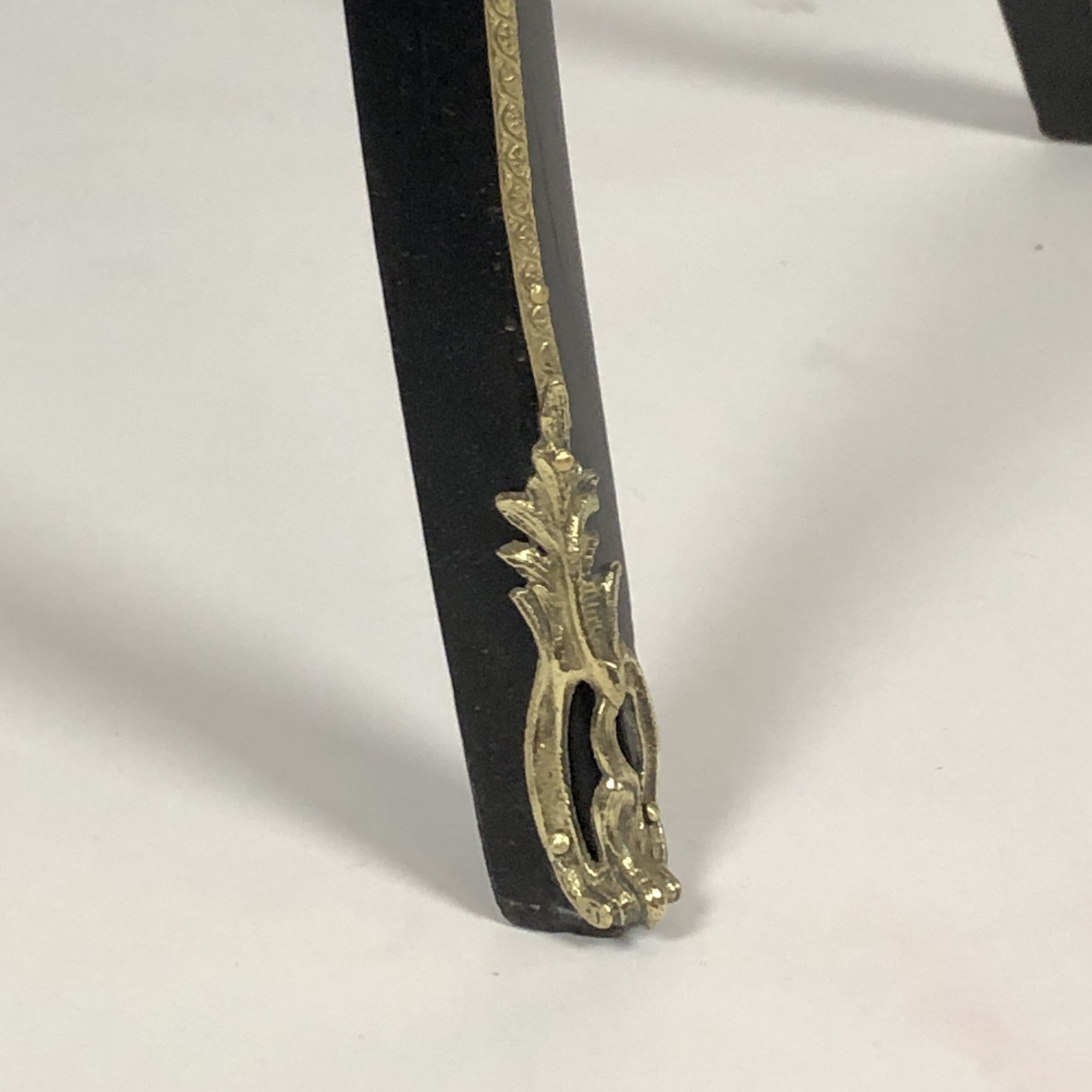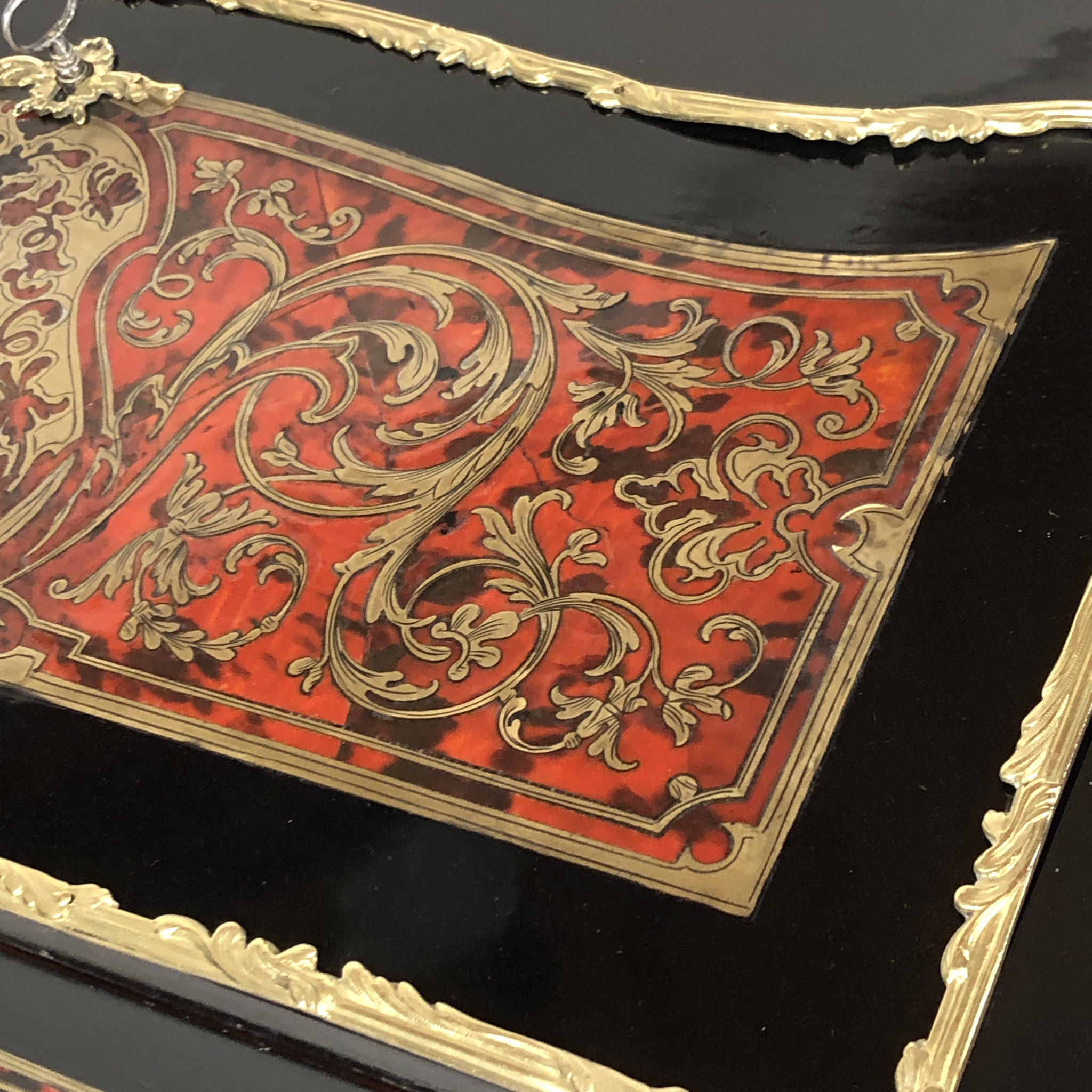 Materiál: ebenový masiv vykládaný intarsií složené z želvoviny, gravírovaných mosazných plátků, celý zdoben aplikami z lité mosazi v rostlinných motivech